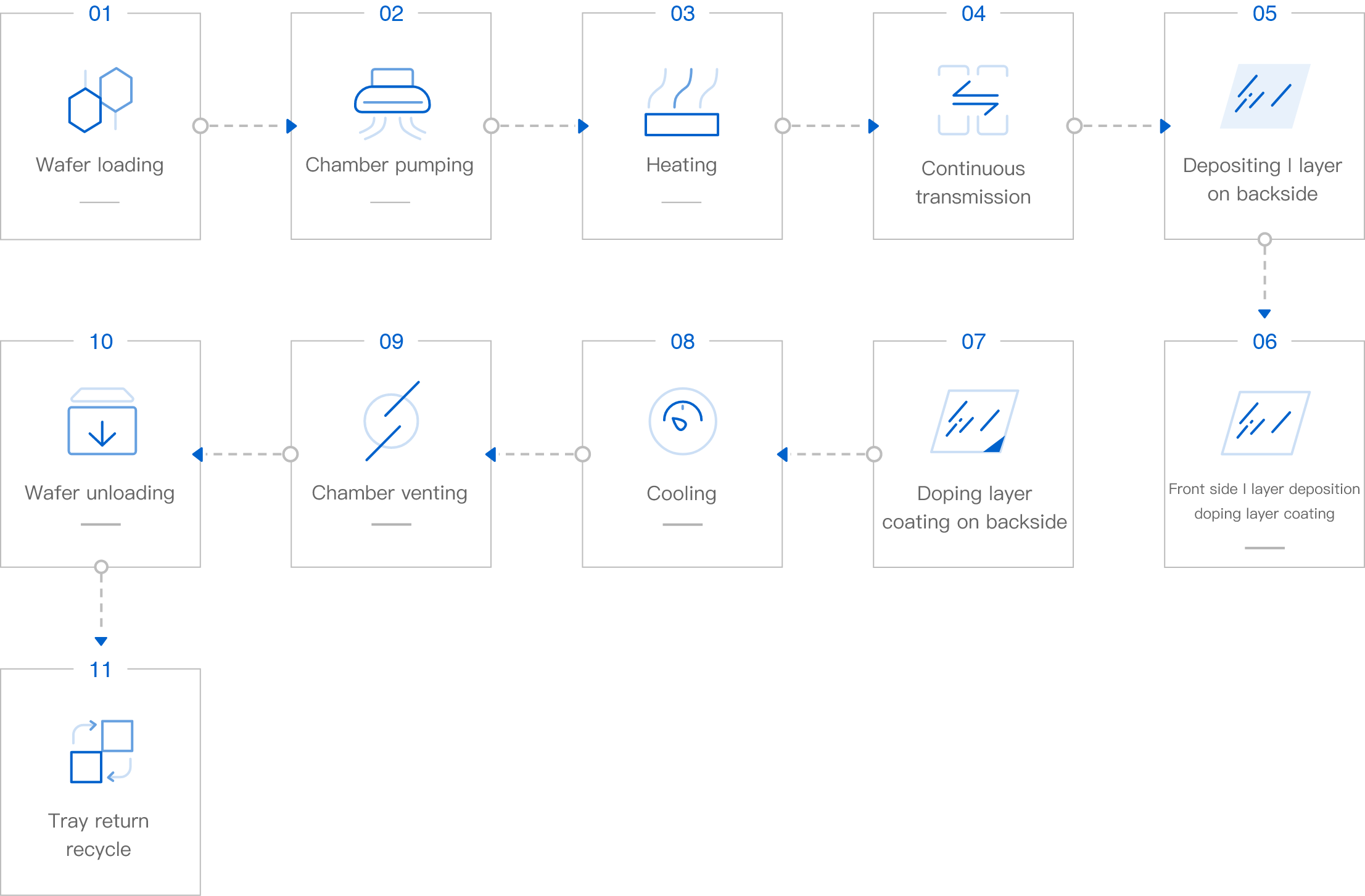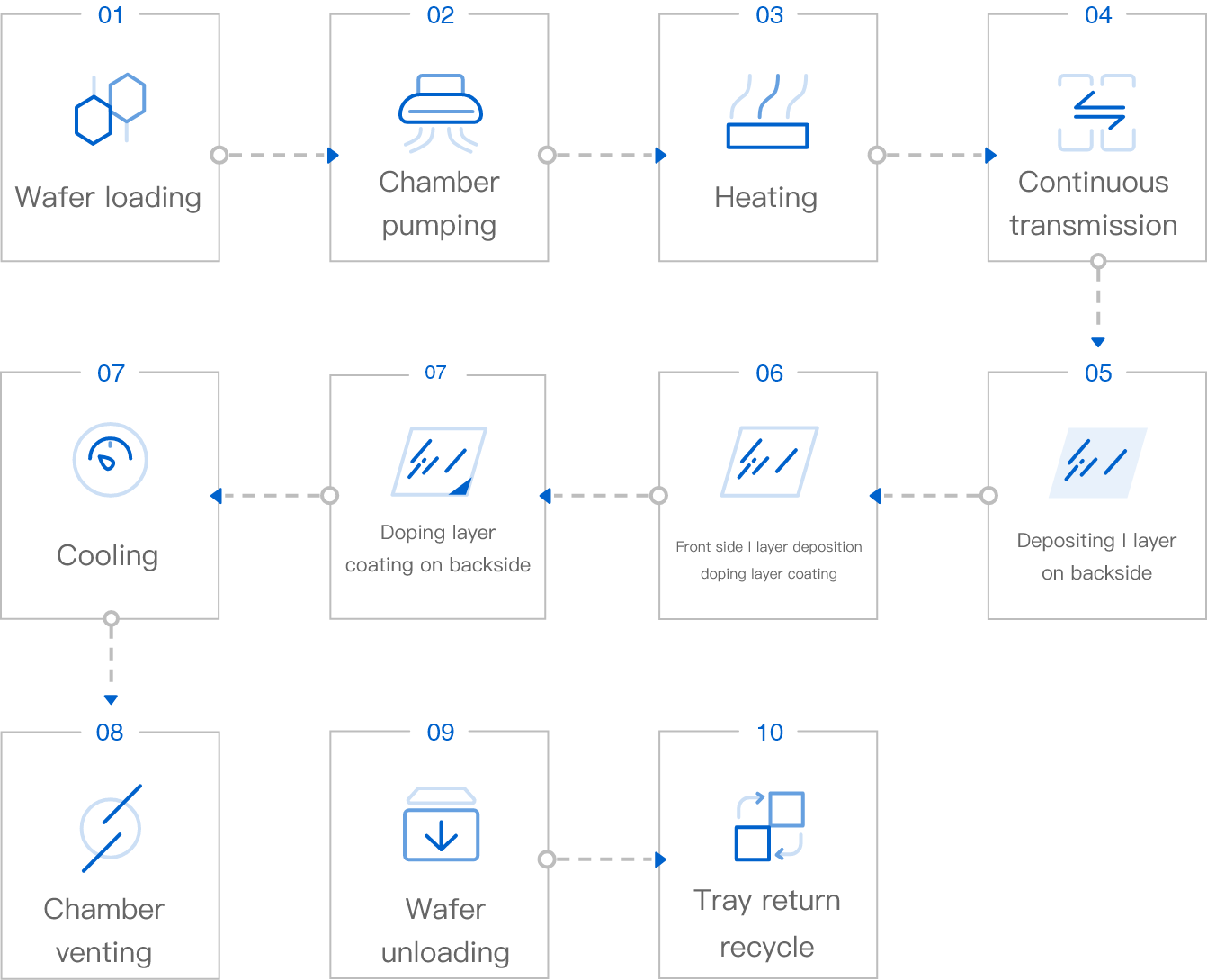A set of inline quasi-dynamic PECVD coating equipment, depositing I layer & doping amorphous silicon film/microcrystalline silicon film on front & backside of wafer