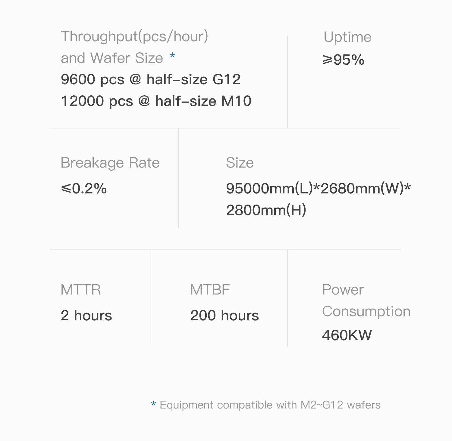 The Whole-line Solution for HJT High Efficiency Cell Manufacturing, which completely covers the four processes of HJT cell production( as shown in the figure below), is independently developed by Maxwell. Through the manufacturing process for larger, thinner and half-sized wafers, the Whole-line Solution combines innovative process route, integrated MES intelligent system to further improve the conversion efficiency, yield and production capacity of solar cells, while reducing the production cost.